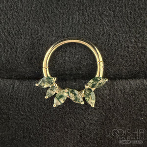 Created with six Moss Agate faceted marquise gems and finely crafted solid gold, Alicia presents a sophisticated clicker!