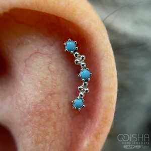 Add a touch of Bohemia to your curated ear with the Junipurr 14ct Gold Harlow End! The cute n' curvy design features delicate beading, whilst the gold compliments the oceanic hues of the turquoise cabochons. A cluster to style the conch, auricle or helix.